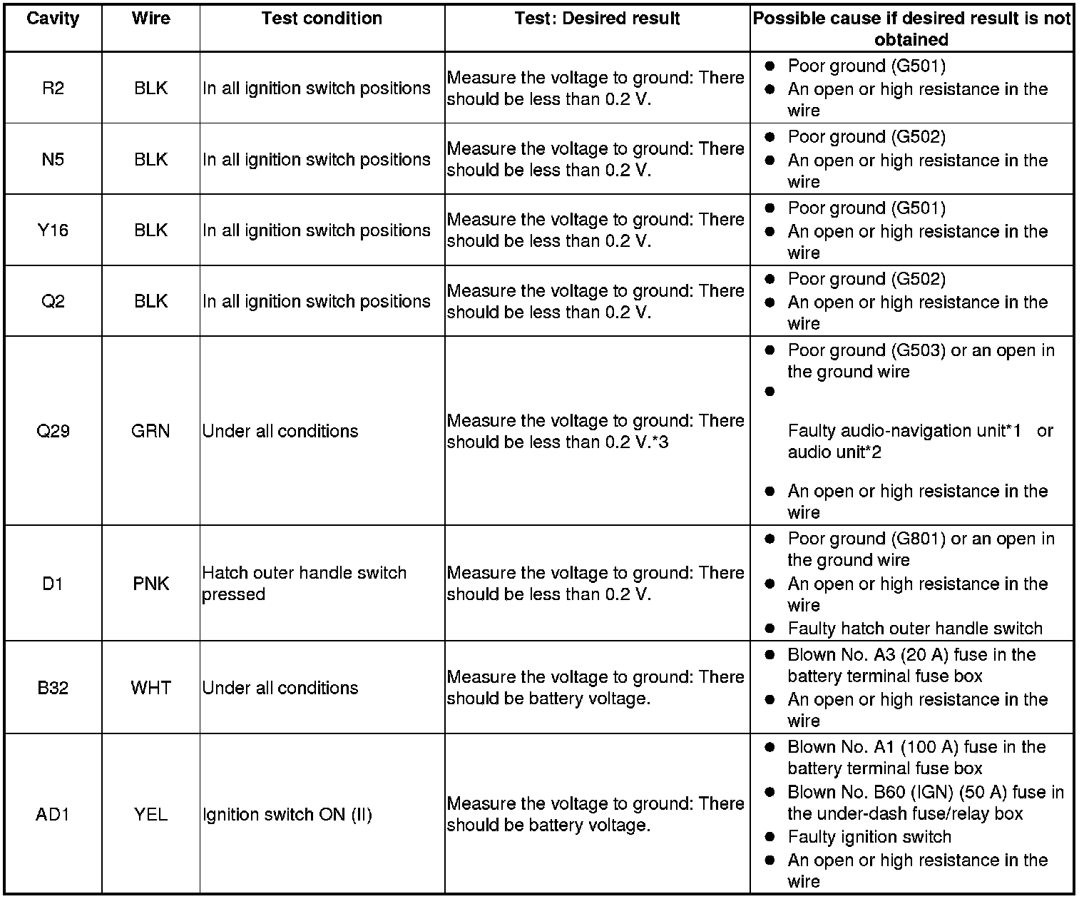 - Before testing, check the No. B1 (15 A), No. B20 (15 A), No. B22 (7.5 A), No. B23 (10A), No. B24 (10A), No. B27 (20 A), No. B35 (7.5 A), No. B36 (10 A), No. B45 (20 A), No. B49 (7.5 A), and No. B60 (50 A) fuses in the under-dash fuse/relay box.