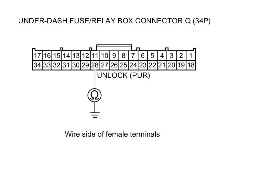 7. Check for continuity between under-dash fuse/relay box connector Q (34P) terminal No. 28 and body ground.