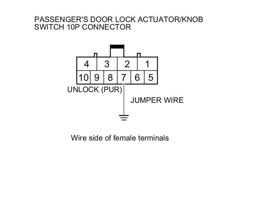 9. Connect passenger's door lock actuator/knob switch 10P connector terminal No. 7 and body ground with a jumper wire.