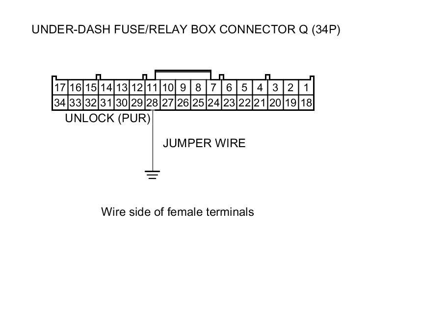 12. Connect under-dash fuse/relay box connector Q (34P) terminal No. 28 and body ground with a jumper wire.