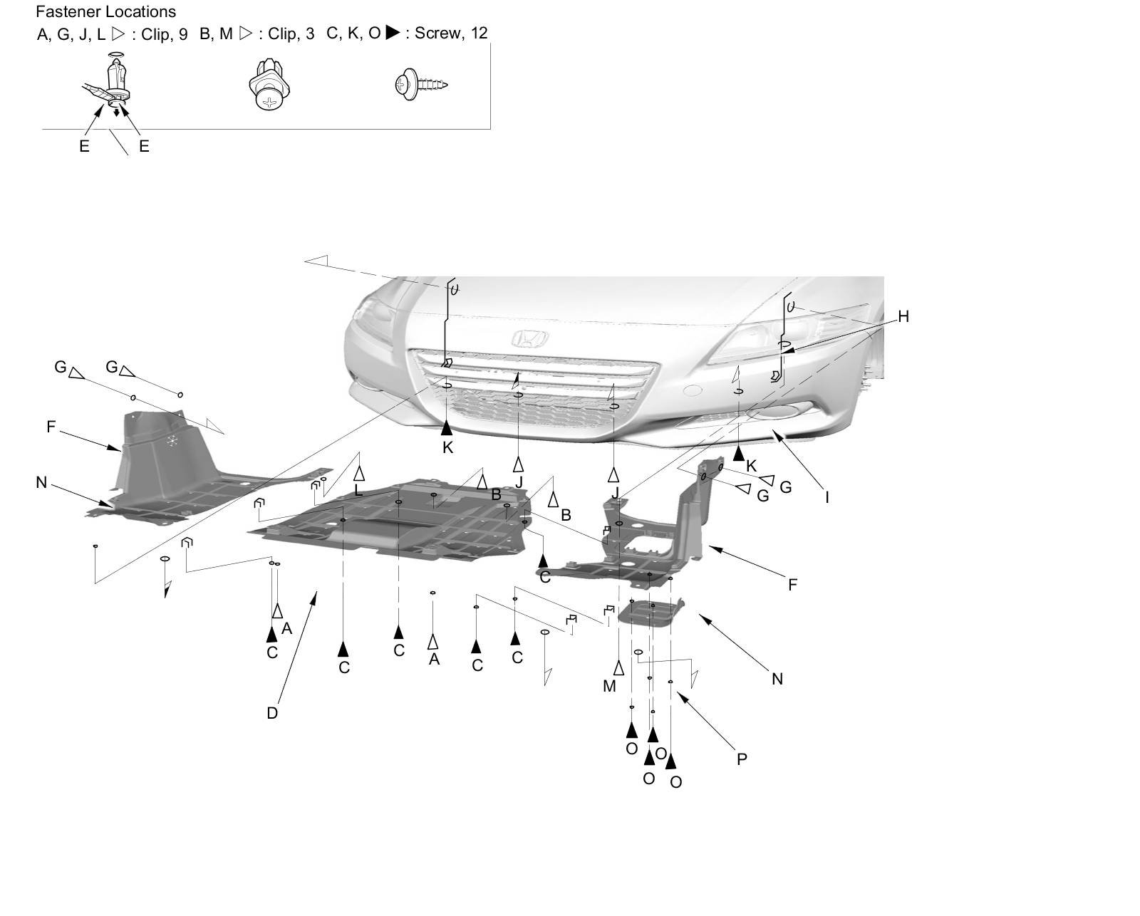 NOTE: To release the clips (G, J, L), pry up on the center pin at the notch (E).