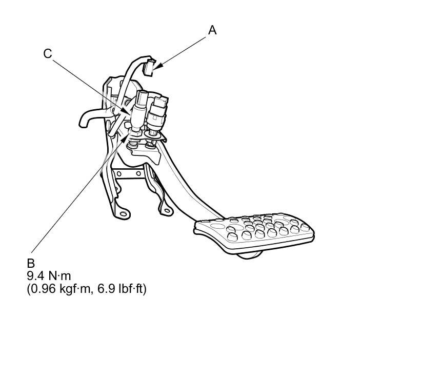 3. Loosen the locknut (B), and remove the idle stop switch (C).