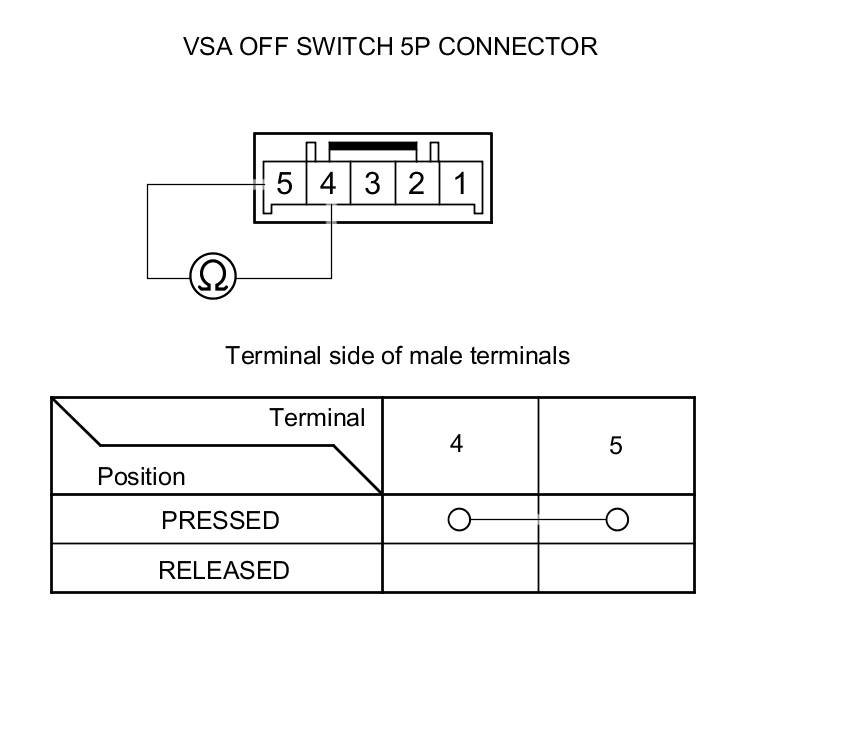 4. On the switch side, check for continuity between the VSA OFF switch 5P connector terminal in each switch position according to the table.