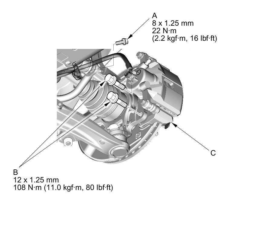 4. Remove the brake caliper bracket mounting bolts (B), then remove the caliper assembly (C) from the knuckle. To prevent damage to the caliper assembly or brake hose, use a short piece of wire to hang the caliper assembly from the undercarriage. Do not twist the brake hose excessively.