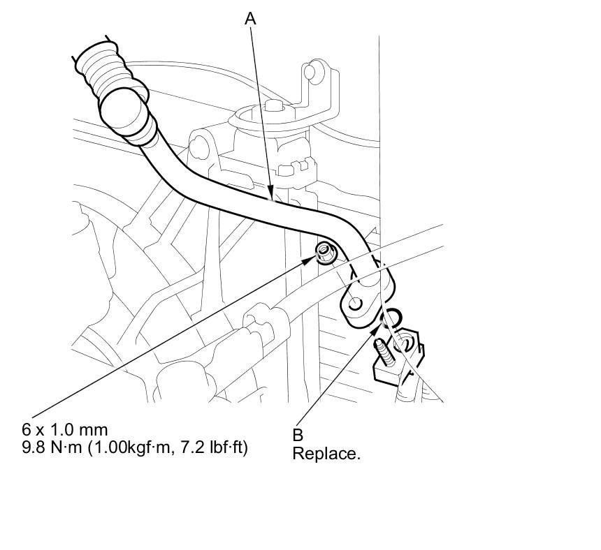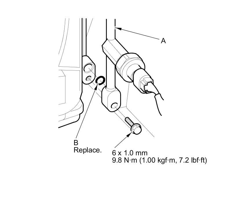7. Remove the bolt, then disconnect the receiver pipe (A) from the A/C condenser. Remove the O-ring (B) from the receiver pipe.