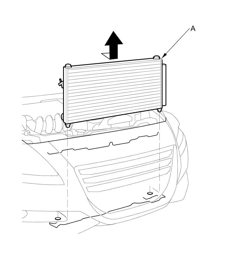 9. Remove the A/C condenser (A) by lifting it up. Be careful not to damage the radiator or A/C condenser fins when removing the A/C condenser.