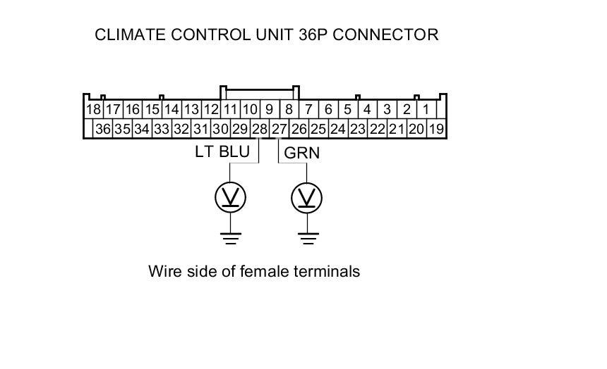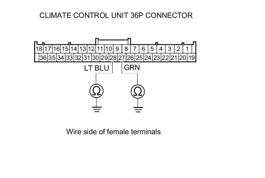 8. Check for continuity between body ground and climate control unit 36P connector terminals No. 27 and No. 28 individually.