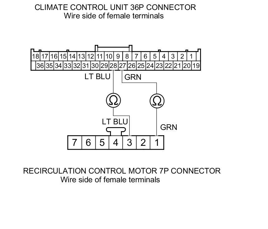 11. Check for continuity between the following terminals of the climate control unit 36P connector and the recirculation control motor 7P connector.