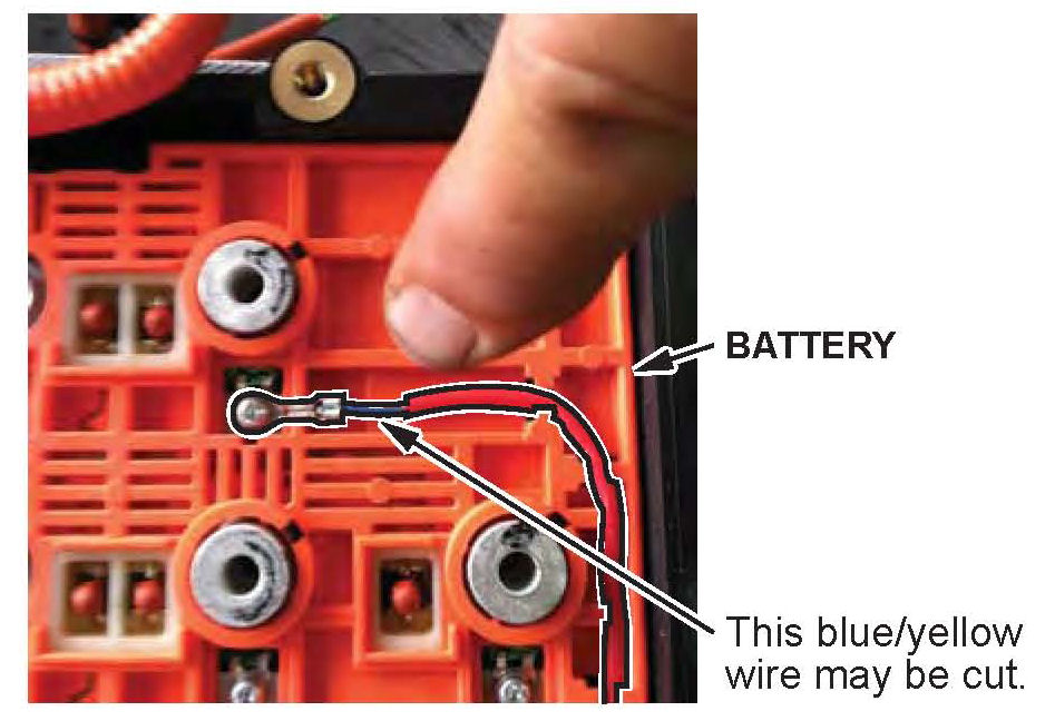 ^ You may notice a blue/yellow wire in red insulation on the battery. If it is cut, do not repair it it is intentionally cut and will set a code if repaired.