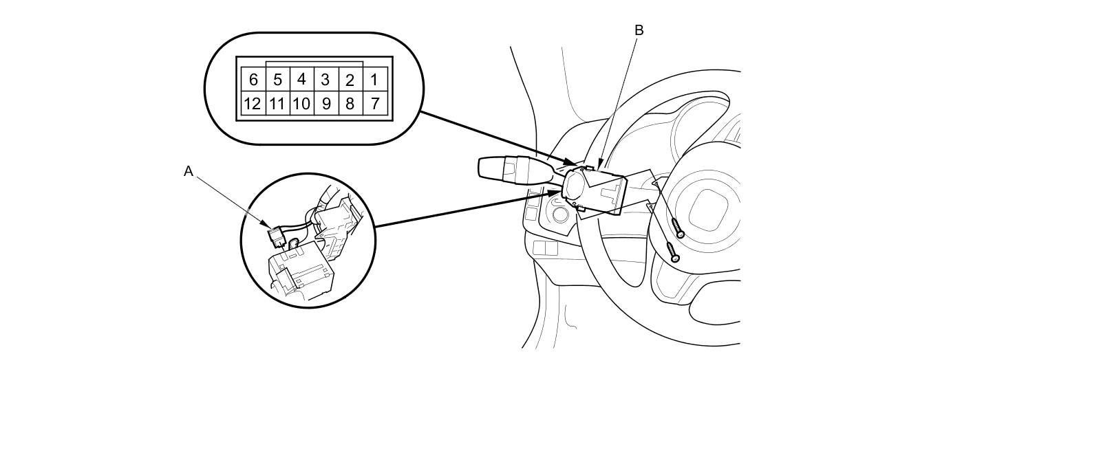 2. Disconnect the 12P connector (A) from the combination light switch (B).