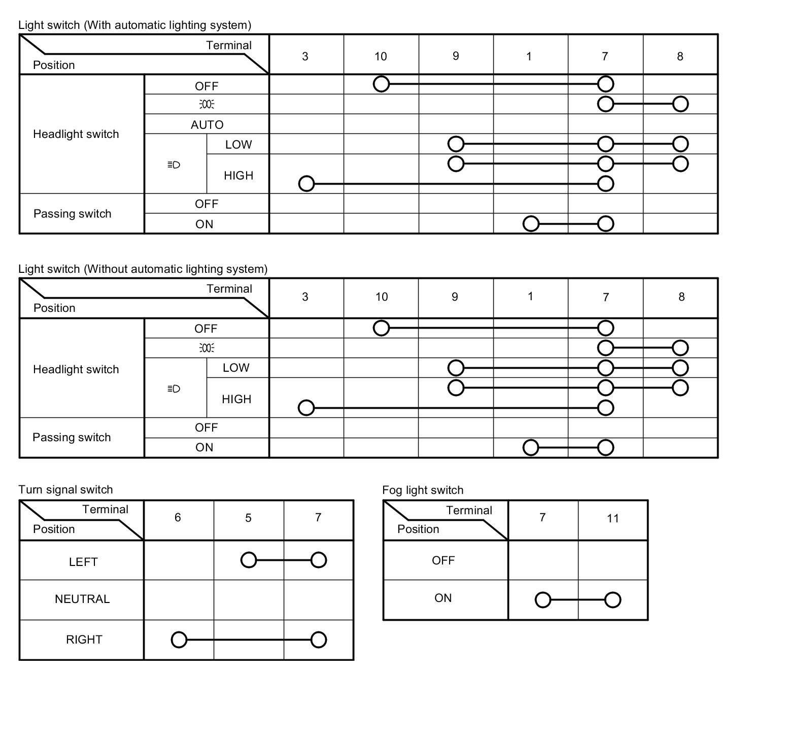 - If the terminals look OK, check for continuity between the terminals in each switch position according to the tables.