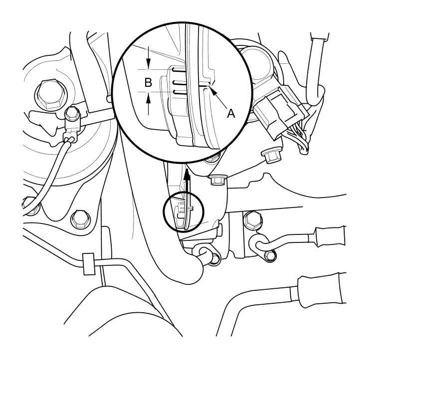 2. Check the position of the drive belt auto-tensioner indicator (A) is within the standard range (B) as shown. If it is out of the standard range, replace the drive belt Service and Repair, then check the drive belt auto-tensioner indicator position.
