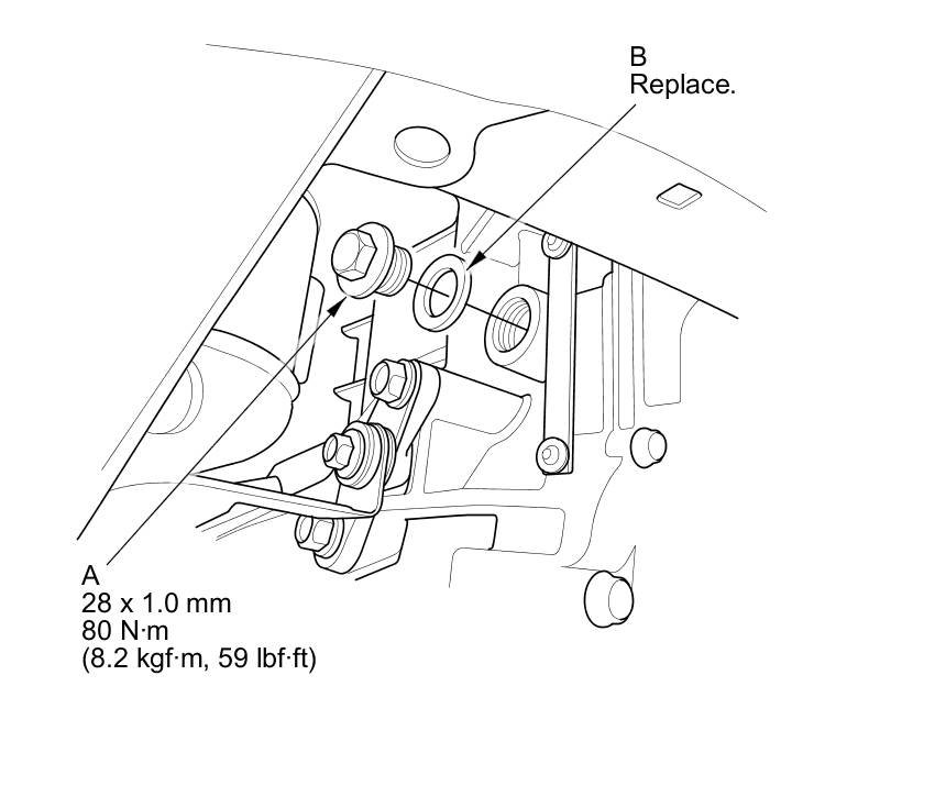 5. After the coolant has drained, reinstall the drain bolt with a new washer (B).