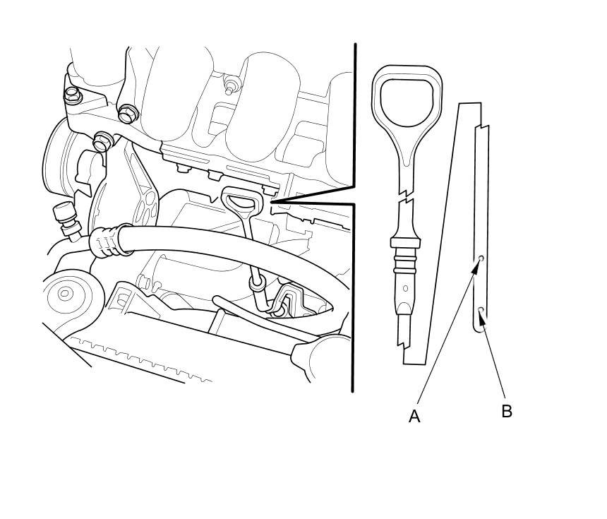 3. Remove the dipstick, and check the engine oil level. It should be between the upper mark (A) and lower mark (B).