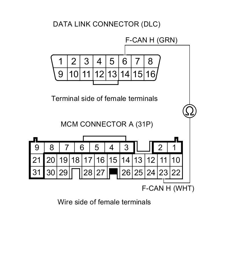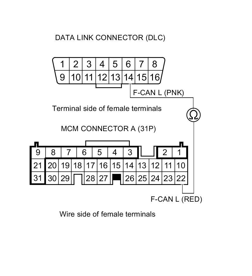 23. Check for continuity between MCM connector terminal A22 and DLC terminal No. 14.