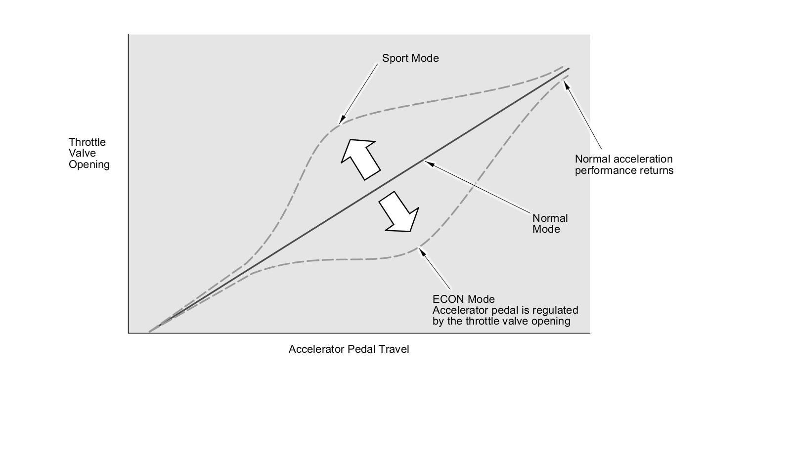 Normal mode: This mode is a balance between driving performance and fuel economy. When you start the engine, the vehicle is in Normal mode. ECON mode: This mode provides the best fuel economy. If the accelerator is pressed quickly, the ETCS (electronic throttle control system) keeps the throttle response steady and smooth. Sport mode: This mode offers increased accelerator response.