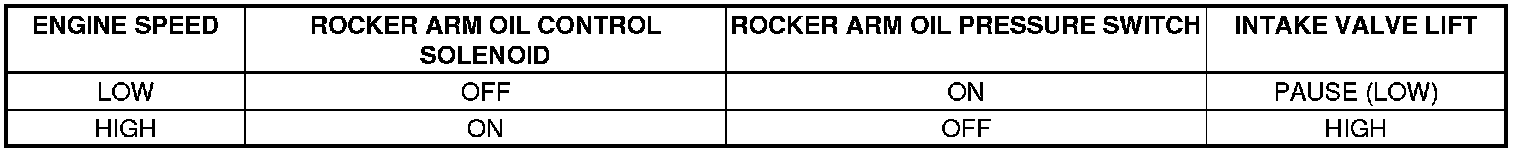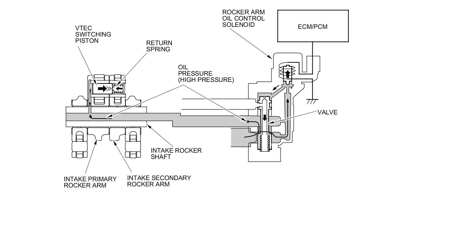 At high engine speed, the rocker arm oil control solenoid is turned on by the ECM/PCM. Oil pressure from the rocker arm control solenoid enters into the intake primary rocker arm via the rocker shaft, and it moves the VTEC switching piston in the rocker arm. This causes the VTEC switching piston to slide into the intake secondary rocker arm, locking the rocker arms together. Both intake rocker arms are lifted by the high lift cam lobe.