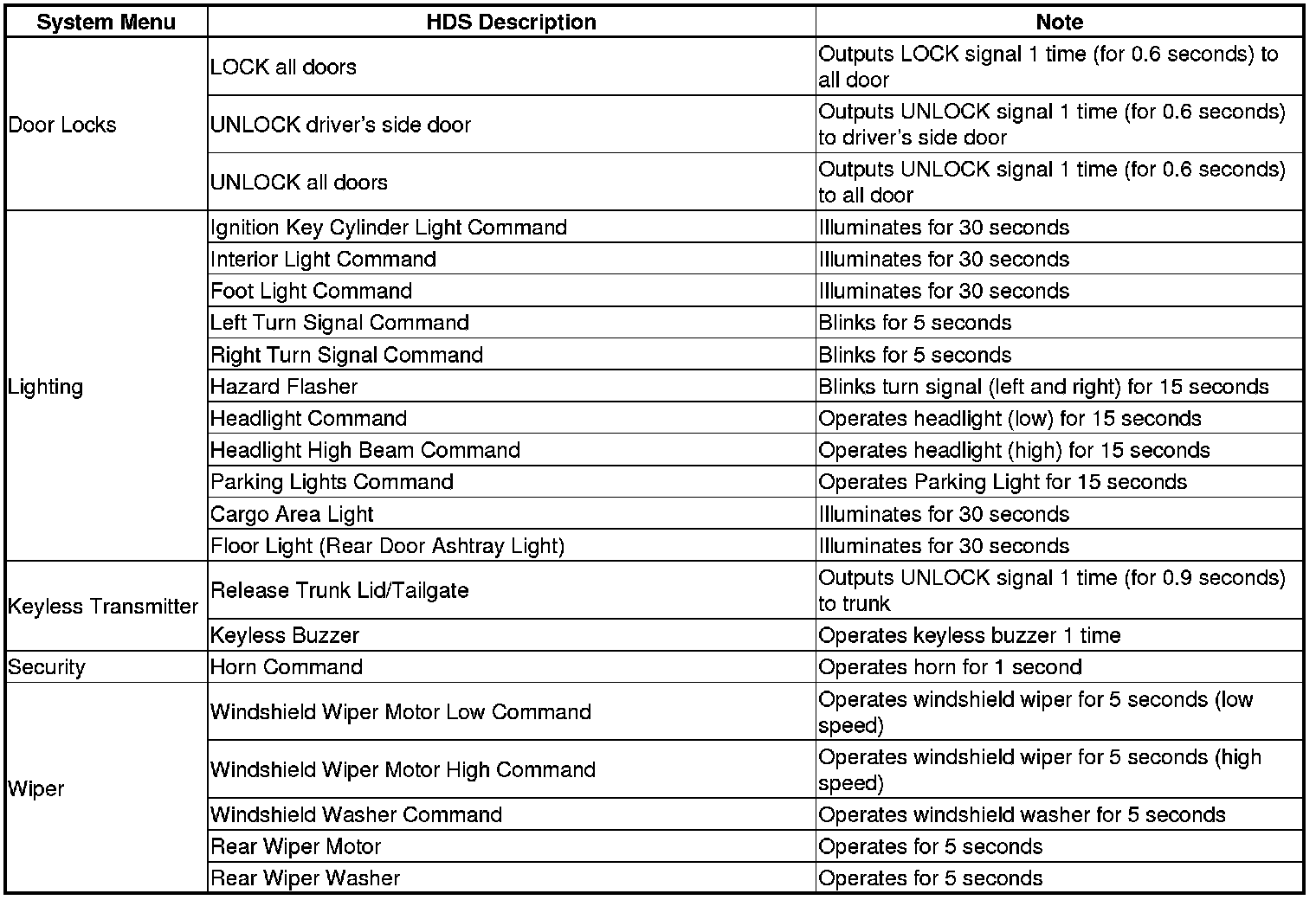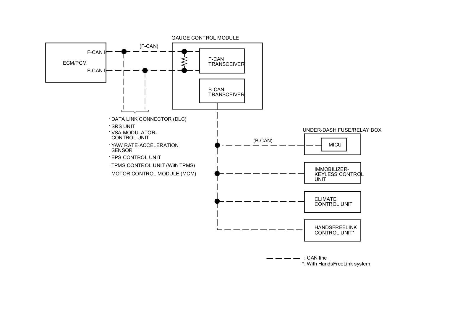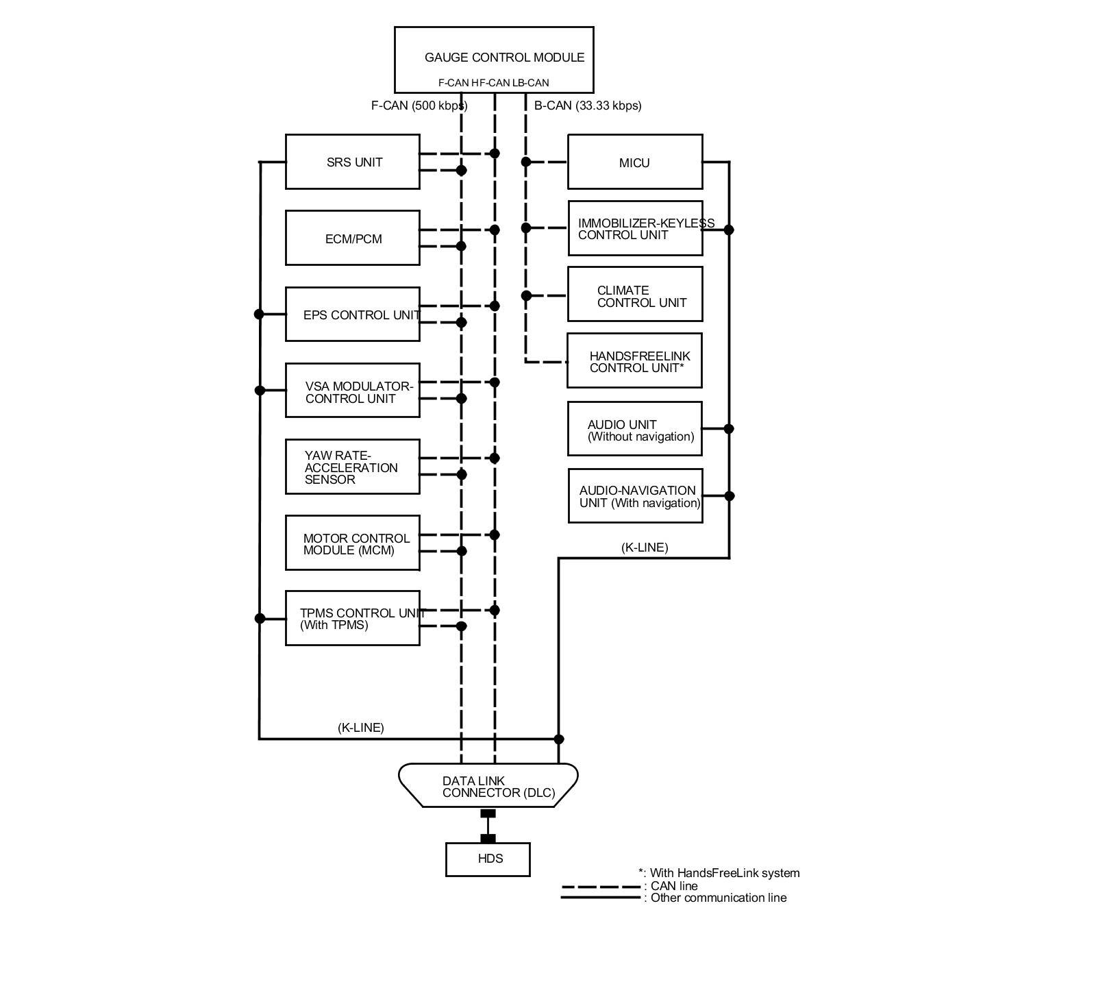 By connecting the HDS to the data link connector (DLC), the HDS can retrieve the diagnostic information from the MICU via a diagnostic line called K-LINE. The K-LINE is separate from the CAN lines, and is connected to the CAN related ECUs. The MICU is a gateway between the HDS and B-CAN related ECUs, and it sends B-CAN diagnostic information to the HDS. When doing a function test with the HDS, the HDS sends an output signal through the K-LINE to the MICU. The MICU either relays the request to another ECU or commands the function itself.