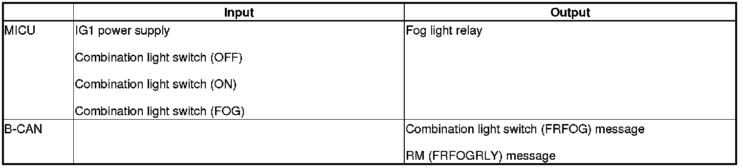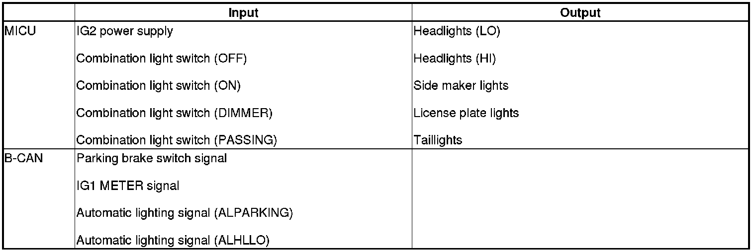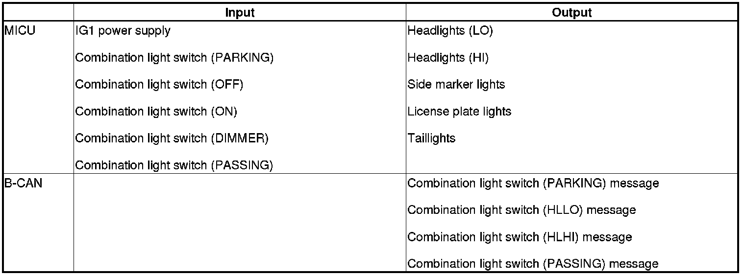 The MICU controls the headlights as daytime running lights based on inputs from each switch and B-CAN signals.