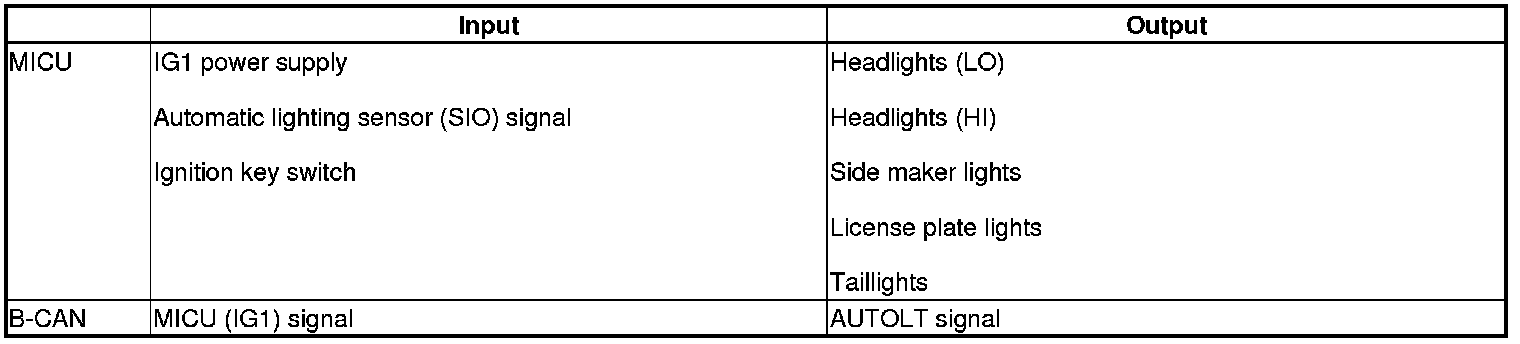 The MICU controls the automatic lighting system based on inputs from the automatic lighting sensor and B-CAN signal.