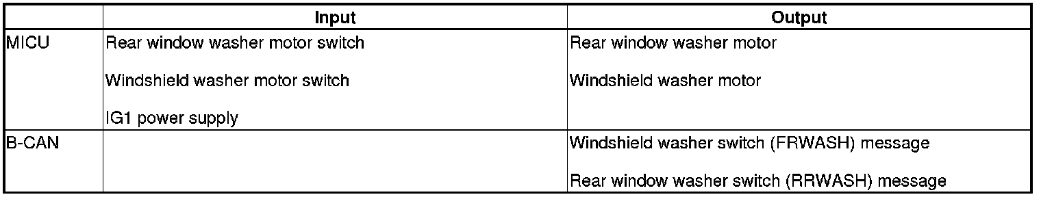 The MICU controls the windshield wiper motor and the windshield washer motor based on inputs from each switch and B-CAN signals.
