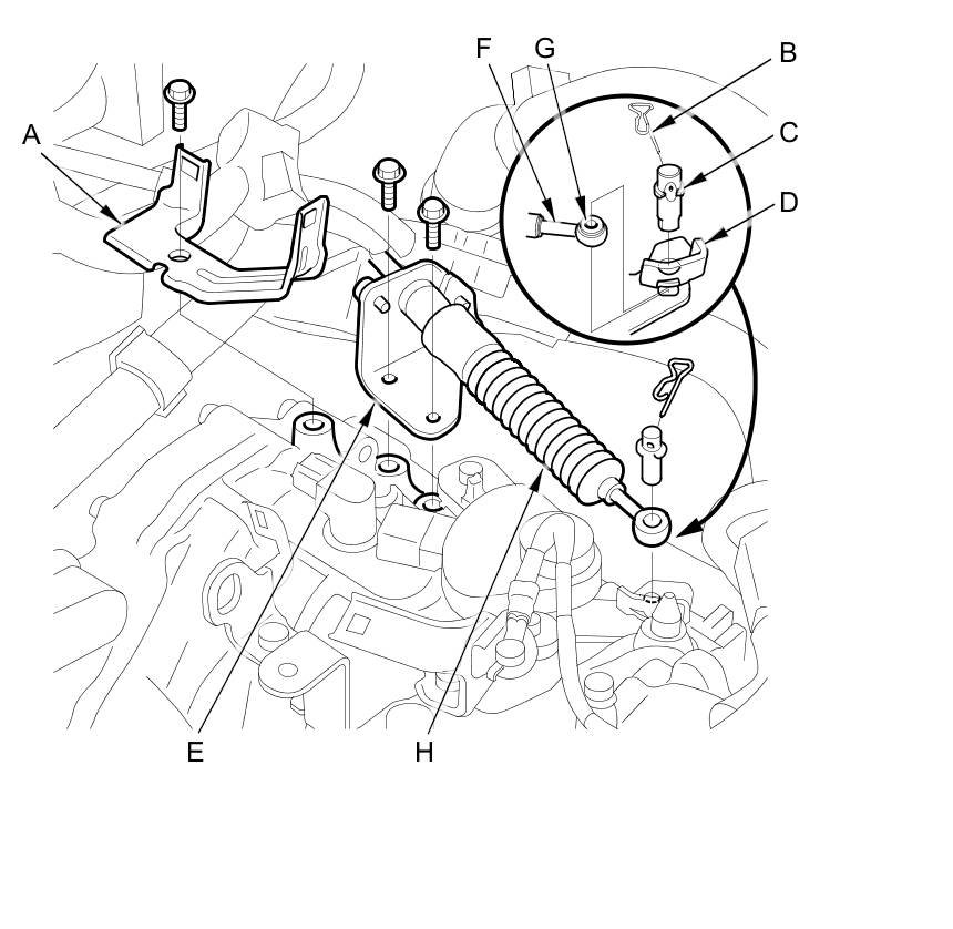 7. Remove the bolts securing the shift cable holder (E), then separate the shift cable end (F) from the selector control lever. Check the shift cable end collar (G) for wear or damage, and replace the shift cable (H) Service and Repair if necessary.