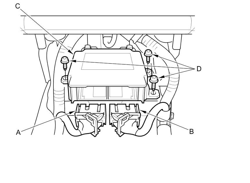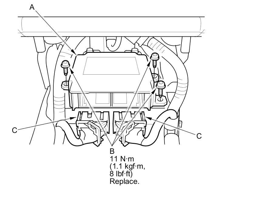 1. Install the SRS unit (A) with new TORX bolts (B), then connect the SRS connectors (C) to the SRS unit; push them into position until they click and the lever locks are fully secured.