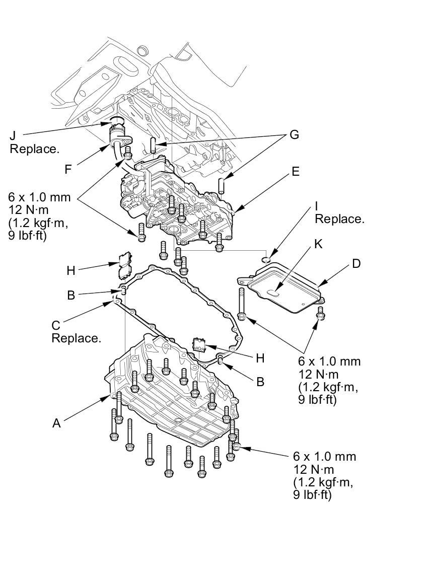CVTF pan (A), the two dowel pins (B), and the gasket (C).