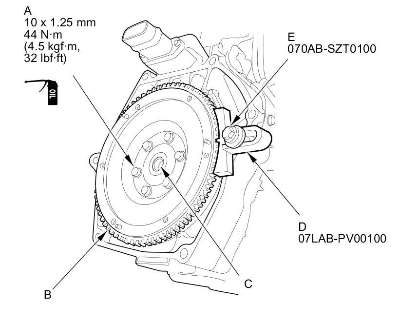 mounting bolts (C) in a crisscross pattern in several steps. Remove the bolts, then remove the flywheel (D) and the ring gear holder.