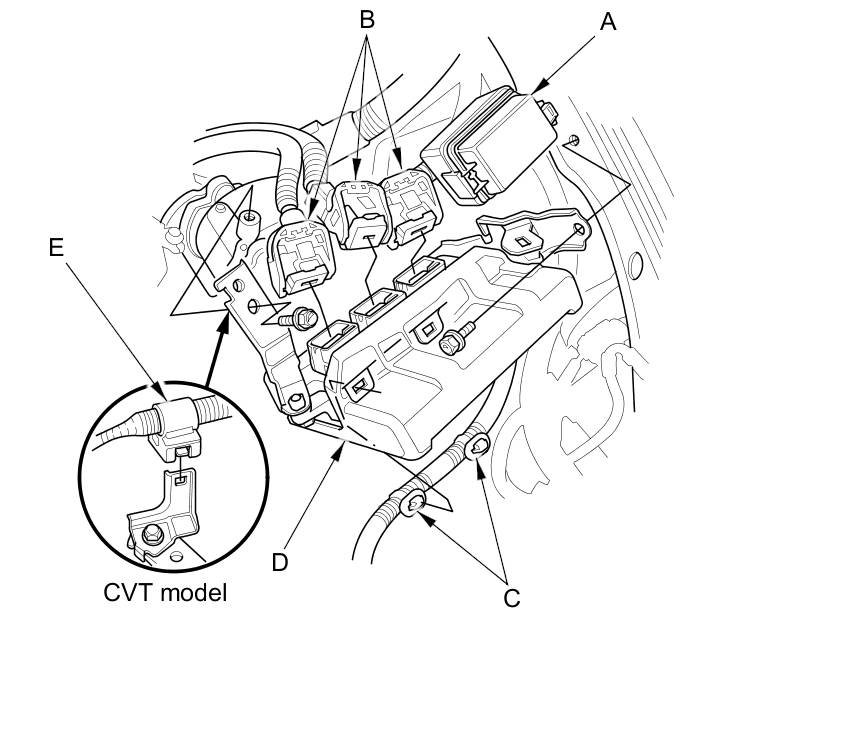 5. CVT model: Remove the harness clamp (E).