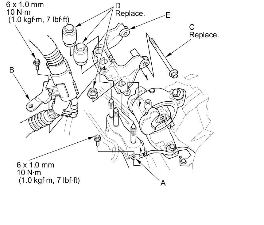 8. Remove the transmission mount bolts (C) and nuts (D), then remove the transmission mount bracket (E).