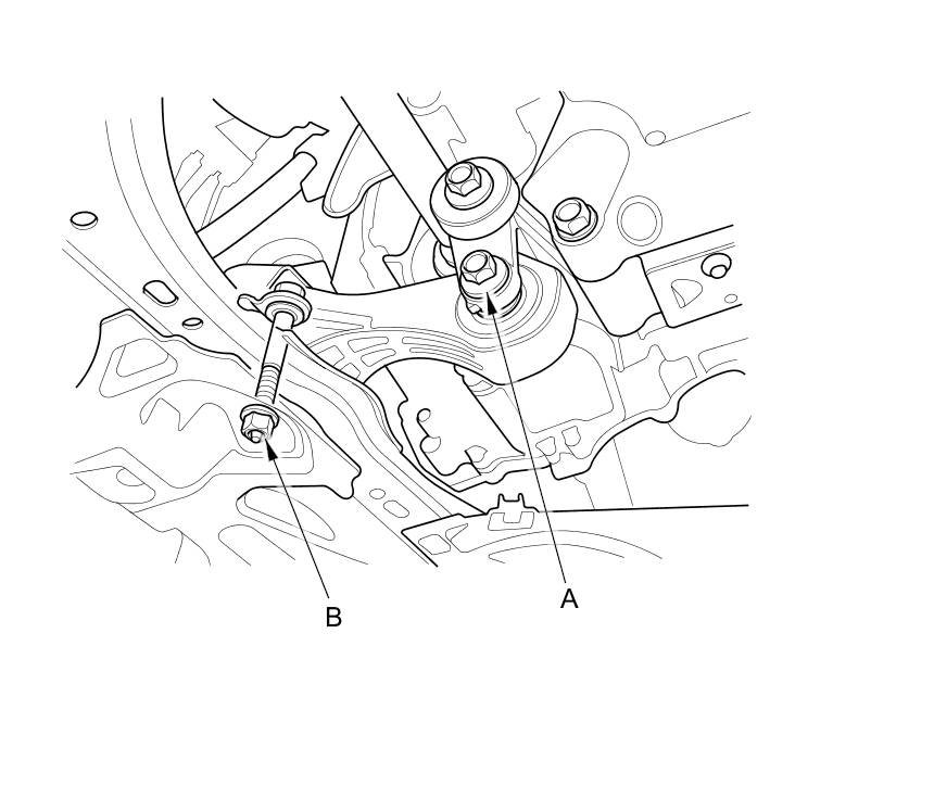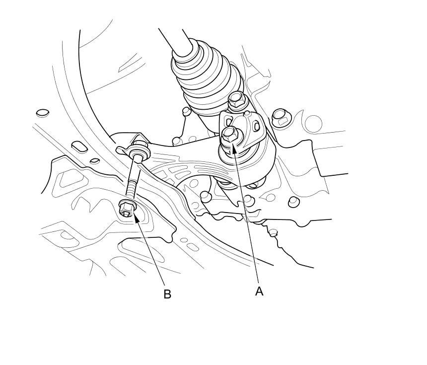 13. Loosen the torque rod mounting bolt (A) and nut (B).
