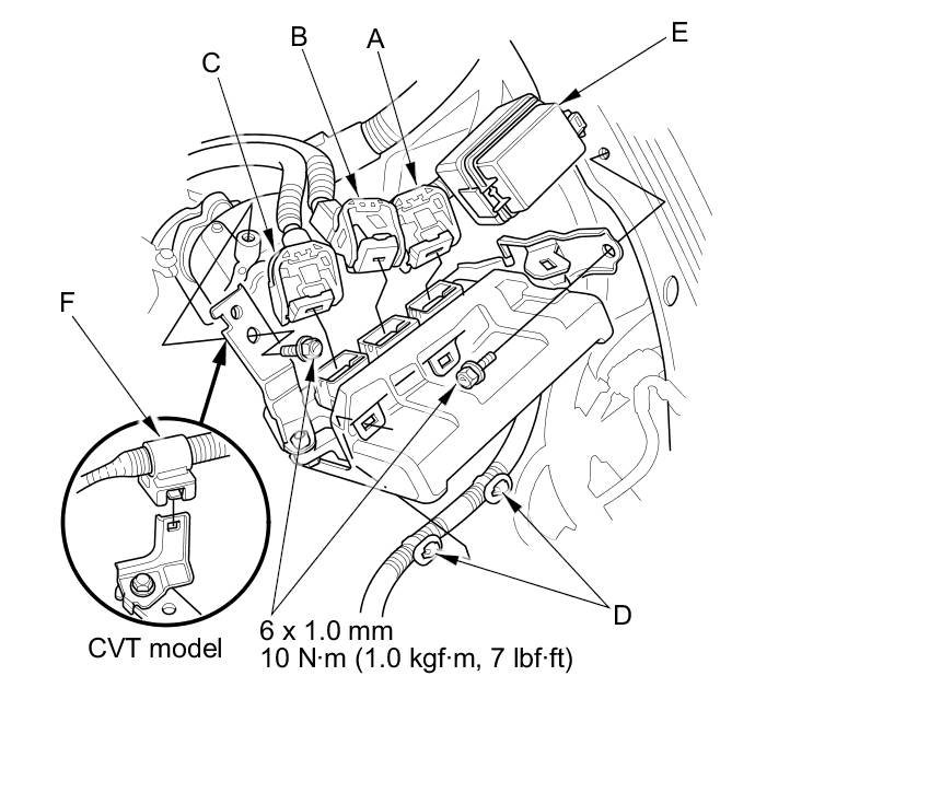 21. CVT model: Install the harness clamp (F).