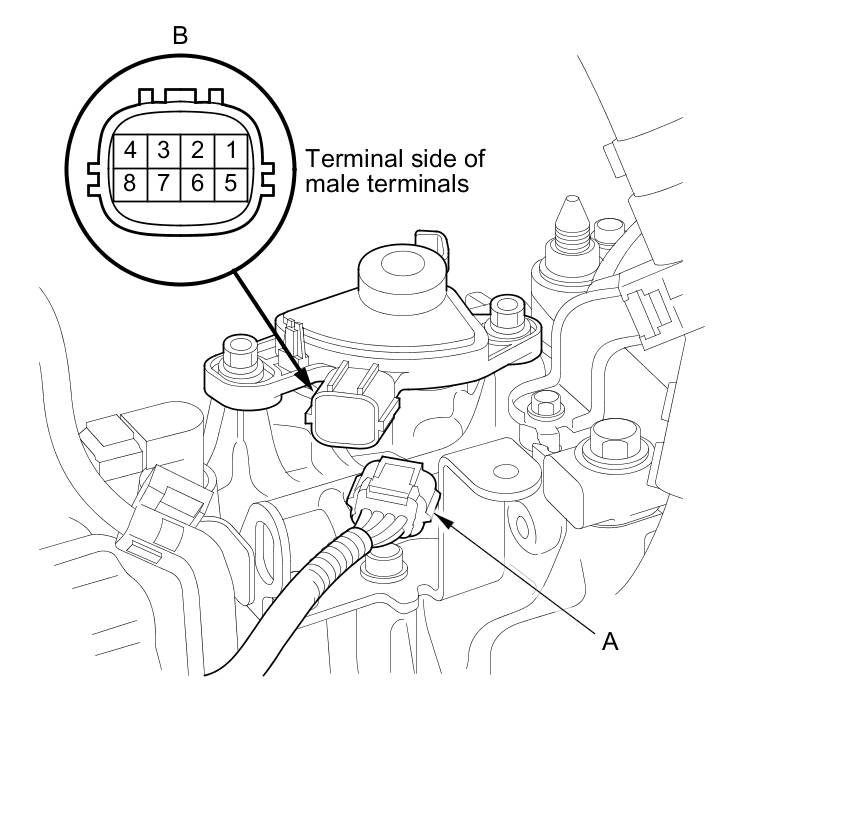 3. Check for continuity between terminals at the transmission range switch 8P connector (B). There should be continuity between the terminals in each switch position as shown in the following table.