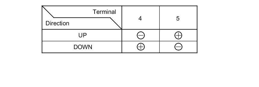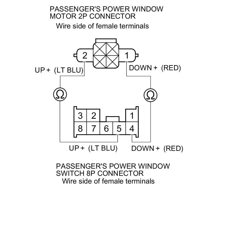 2. Test the motor in each direction by connecting battery power and ground to the passenger's power window switch 8P connector according to the table.