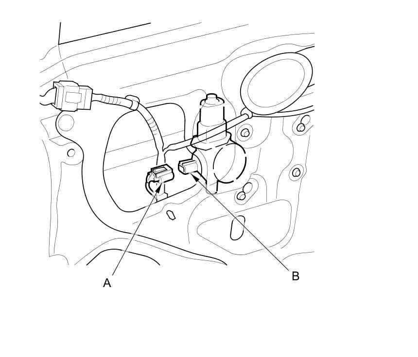 5. Disconnect the 2P connector (A) from the passenger's power window motor (B).