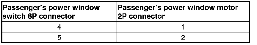 6. Check for continuity between the passenger's power window switch 8P connector terminals and the passenger's power window motor 2P connector terminals as shown.
