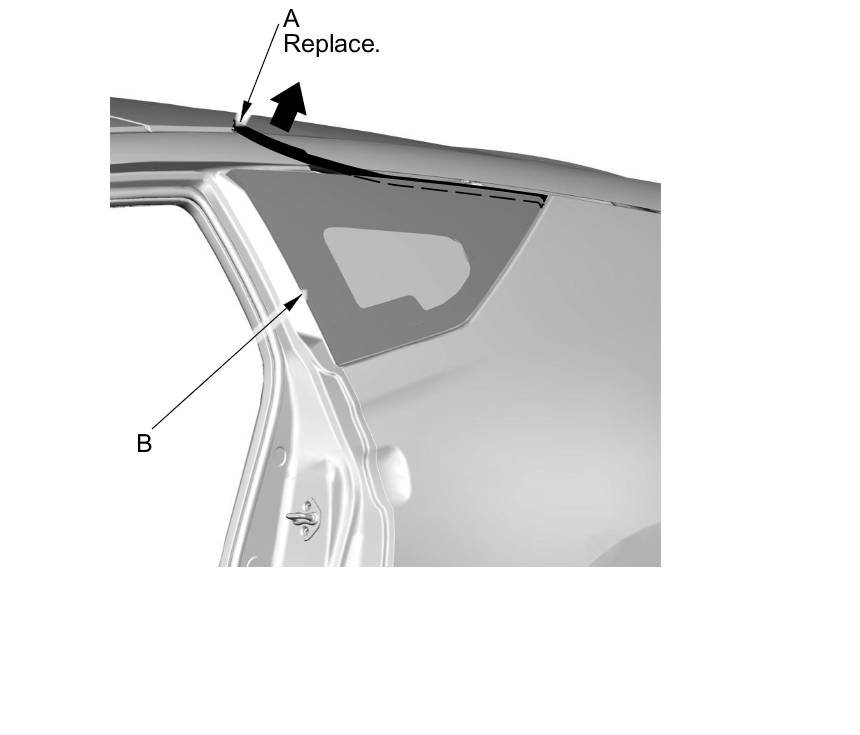2. Remove the quarter glass molding (A) from the edge of the quarter glass (B). If necessary, cut the molding with a utility knife.