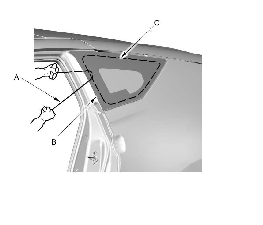 4. With a helper on the outside, pull the piano wire (A) back and forth in a sawing motion. Hold the piano wire as close to the quarter glass (B) as possible to prevent damage to the body, and carefully cut through the adhesive (C) around the entire quarter glass.