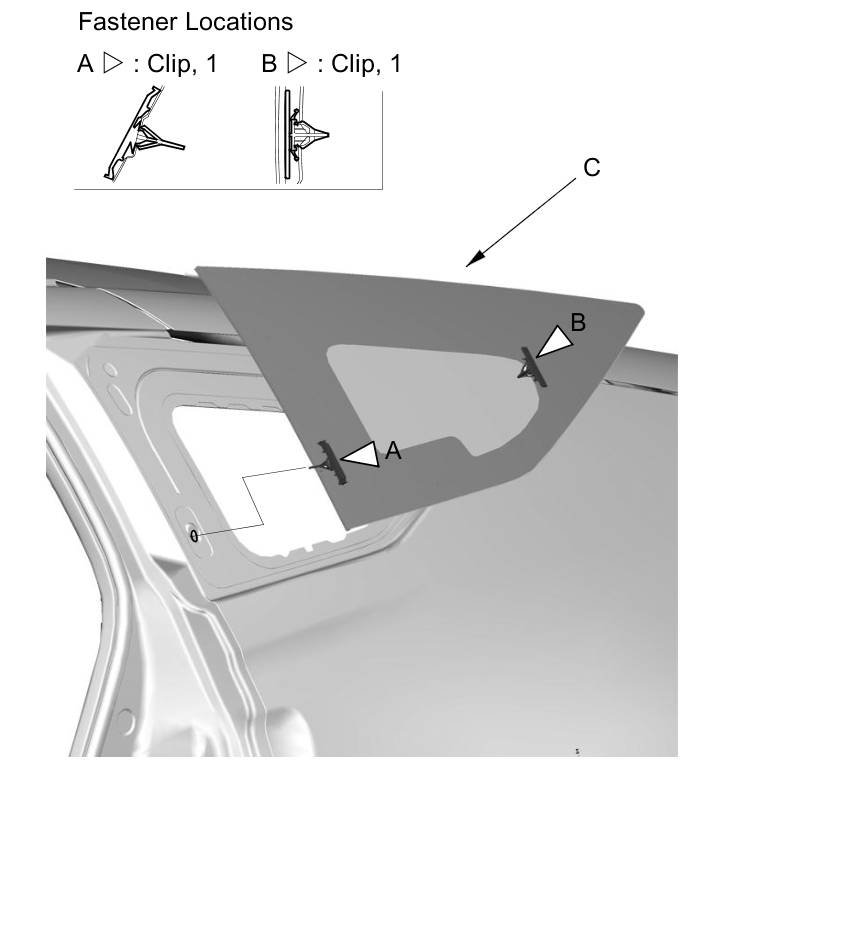 5. With a helper on the out side, hold the quarter glass with suction cups, then detach the clips (A, B).