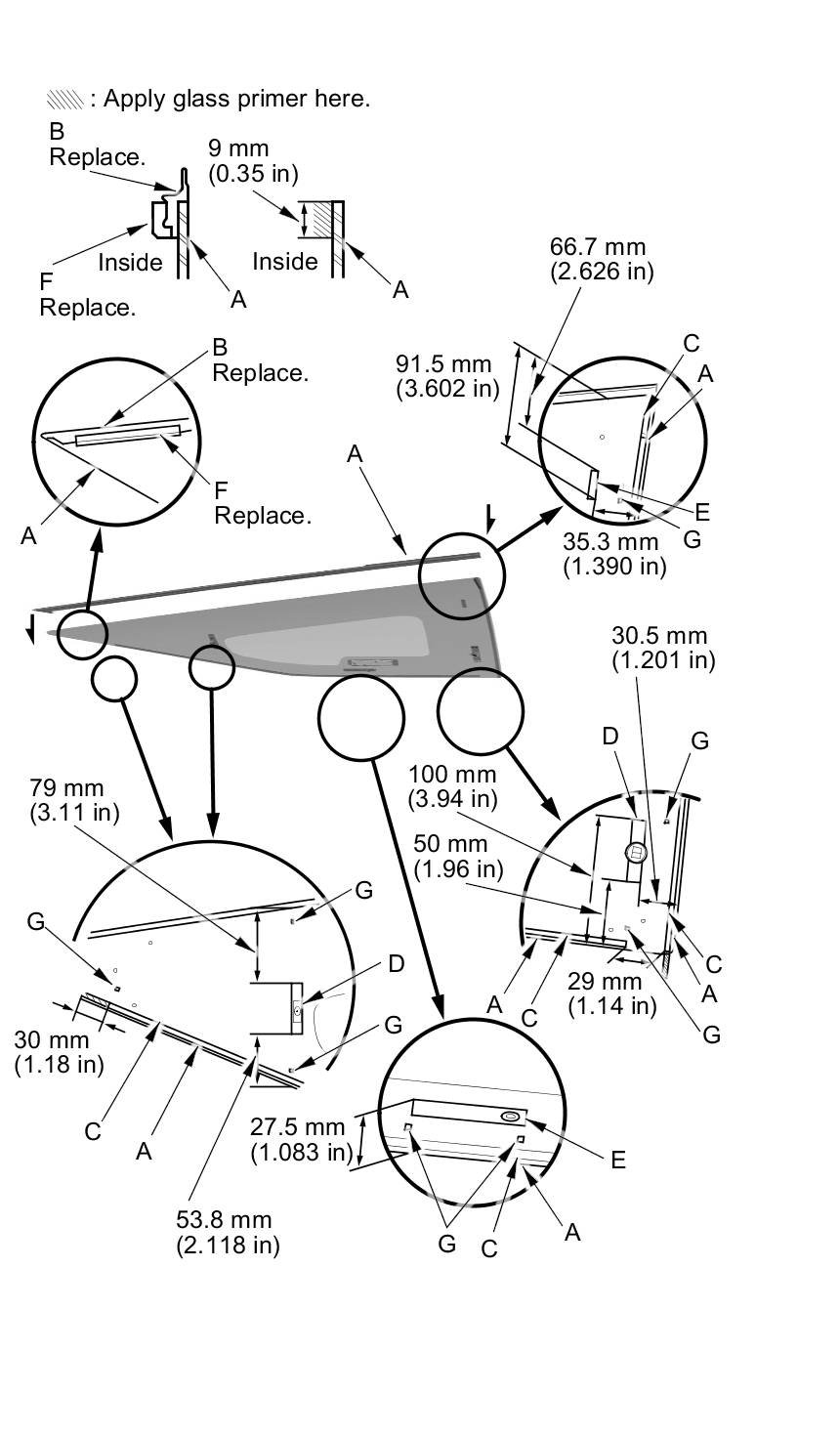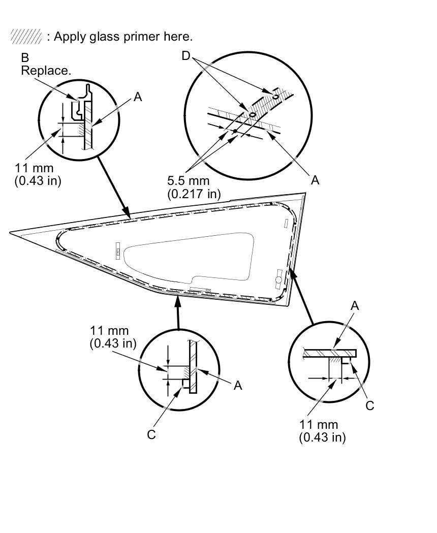 - With the printed dots (D) on the quarter glass as a guide, apply the glass primer to the upper, lower, and rear corner portions of the quarter glass.