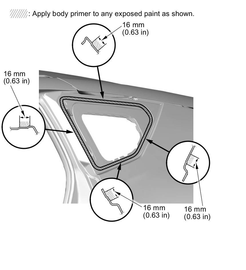 14. Carefully apply a light coat of body primer to any exposed paint or metal around the flange where new adhesive will be applied. Let the body primer dry for at least 10 minutes: