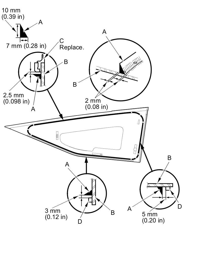 16. Pack adhesive into the cartridge without air pockets to ensure continuous delivery. Put the cartridge in a caulking gun, and run a continuous bead of adhesive (A) around the edge of the quarter glass (B) and along the molding (C) and the rubber dam (D) as shown.