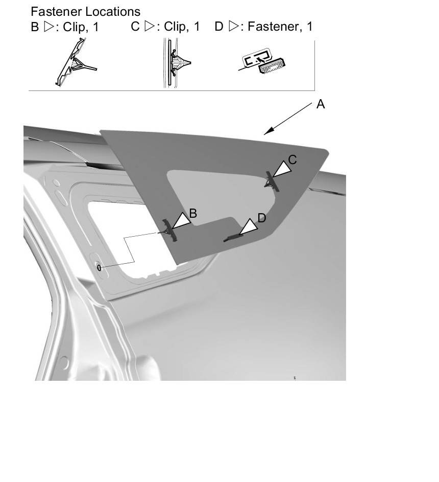 17. Hold the quarter glass (A) over the opening with suction cups, align it with the clips (B, C) and the fastener (D), and set it down on the adhesive. Lightly push on the quarter glass until its edges are fully seated on the adhesive all the way around.