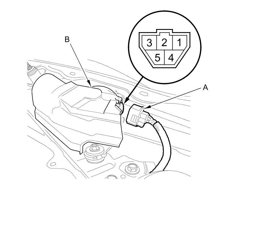 2. Disconnect the 5P connector (A) from the windshield wiper motor (B).