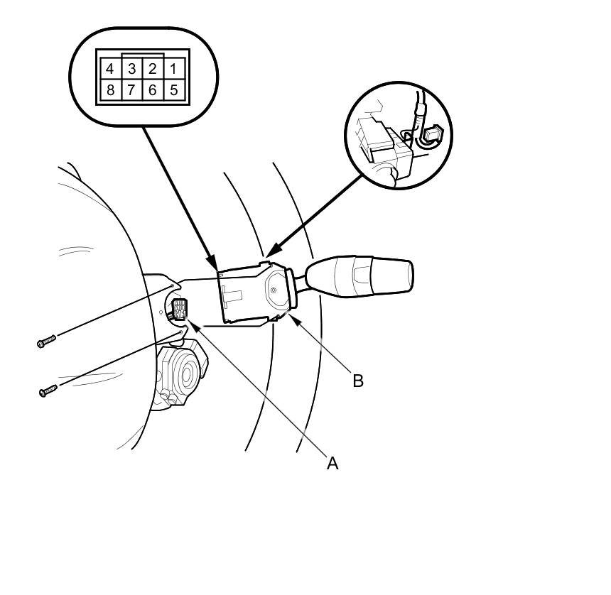 2. Disconnect the 8P connector (A) from the wiper/washer switch (B).
