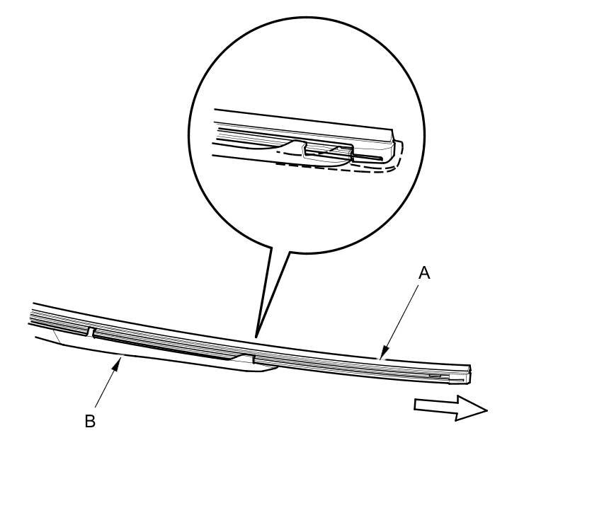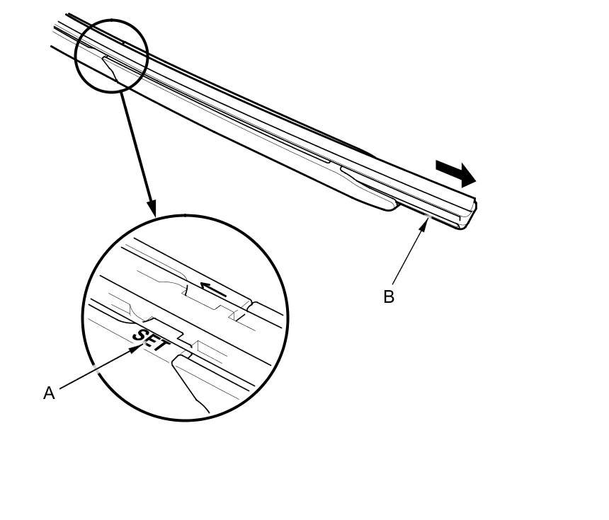 3. Locate the word SET (A) and the arrow on the wiper blade holder, then pull the blade (B) in the opposite direction of the arrow to remove it.