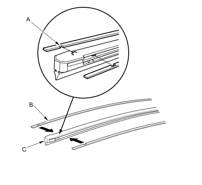 4. Align the groove (A) of each rail (B) with the tabs in a new blade (C), then install the blade and the rails into the blade holder in the reverse order of removal.