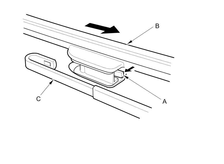 2. Push the lock (A) of the wiper blade assembly (B), and remove the wiper blade assembly from the wiper arm (C).
