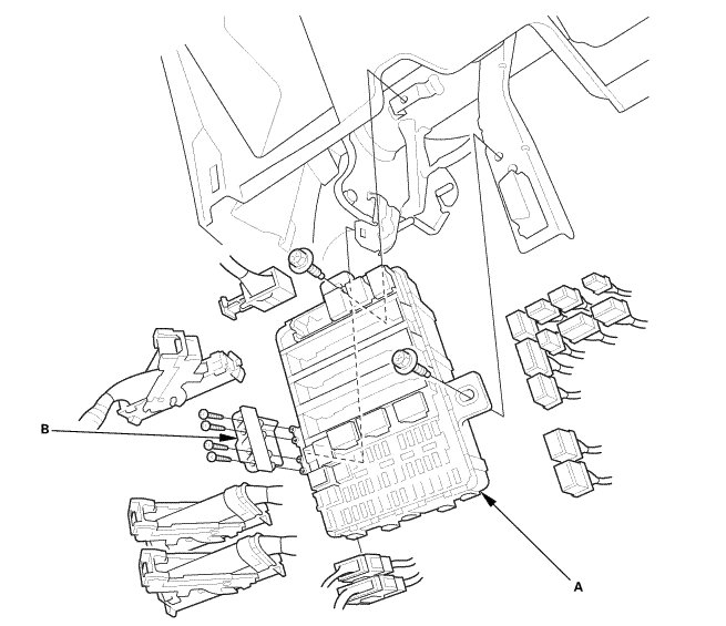 1. Disconnect the connectors from the fuse side of the under-dash fuse/relay box (A).